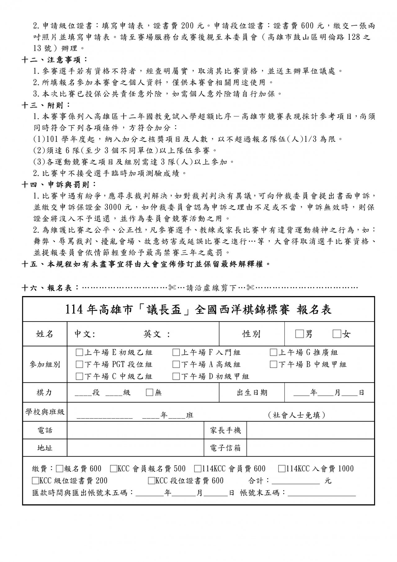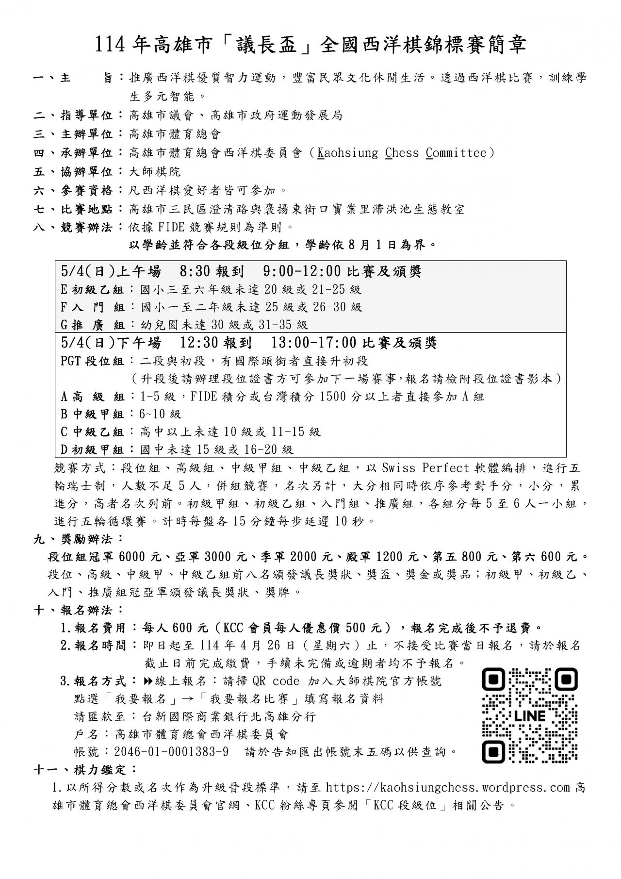 114年高雄市「議長盃」全國西洋棋錦標賽簡章